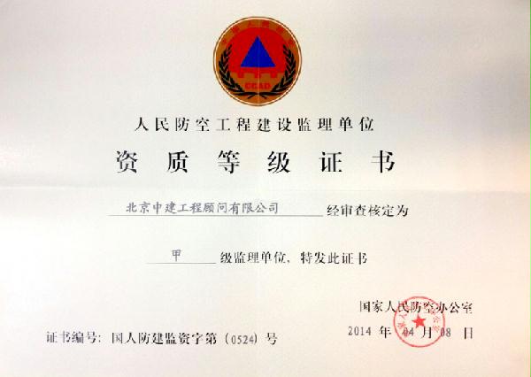 我公司于2014年4月8日取得了人民防空工程建设监理单位甲级资质等级证书。人防工程由主体工程、配套工程及地面附属设备设施用房组成。是为保障人防指挥、信息、疏散、掩蔽、储备、救护等需要而单独修建的地下防护建筑。取得该资质,公司可以承接全国范围内各种抗力等级的人防工程监理业务。为公司今后人防工程业务的展开提供了必要条件,是公司综合实力提升的具体体现,也是公司发展历程中的一件大事。