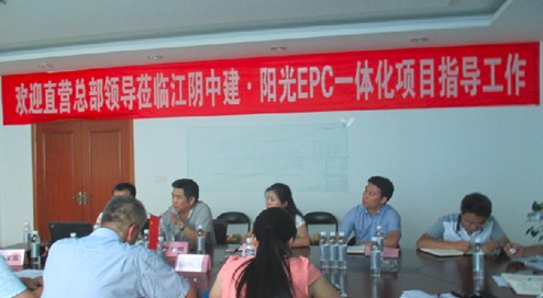 2014年7月31日,中建设计集团直营总部书记顾宁义、院长赵维勇、助理总经理马雁宏、审计监察部经理赵洁等一行四人由顾问公司于吉鹏总经理及EPC事业部邓广磊经理陪同,对江阴中建阳光EPC一体化项目进行了考察调研。