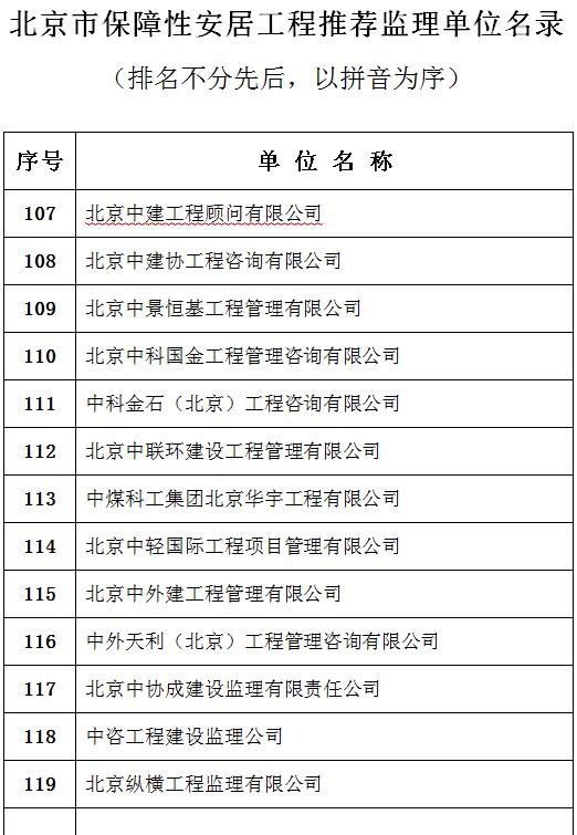 2016年4月1日,经北京市住建委同意,北京监理协会公开发布了《关于比选产生保障性安居工程推荐监理单位名录的通知》(京监协【2016】4号)。比选工作按照标准公开统一、企业自愿申报、专家集中评审、重点面试通过的原则,经专家组评审、面试,征求相关部门意见建议等程序,产生了《北京市保障性安居工程推荐监理单位名录》,共有119家单位入选。此后,我市保障性安居工程的监理单位,优先自此名录中选用。