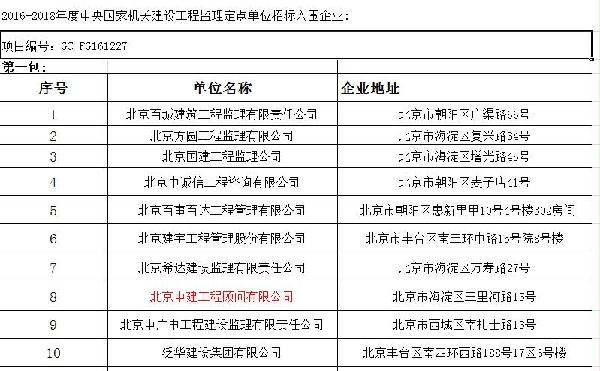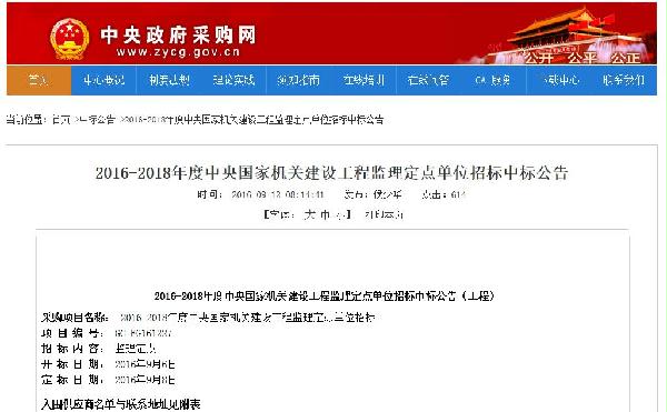 2016年9月12日,中央国家机关公告公示2016-2018年度中央国家机关建设工程监理定点单位招标入围名单,北京中建工程顾问有限公司凭借丰富的监理业务经验得到了招标单位的肯定,在竞争中脱颖而出,最终成功入围。截止2016年,我公司已连续九年入围中央国家机关房屋建筑工程监理定点单位!