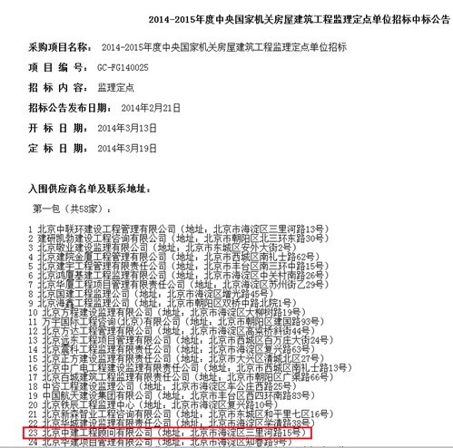 2014年3月,公司先后获得中直机关2014年度建设工程监理定点采购项目及2014-2015年度中央国家机关房屋建筑工程监理定点单位资格。